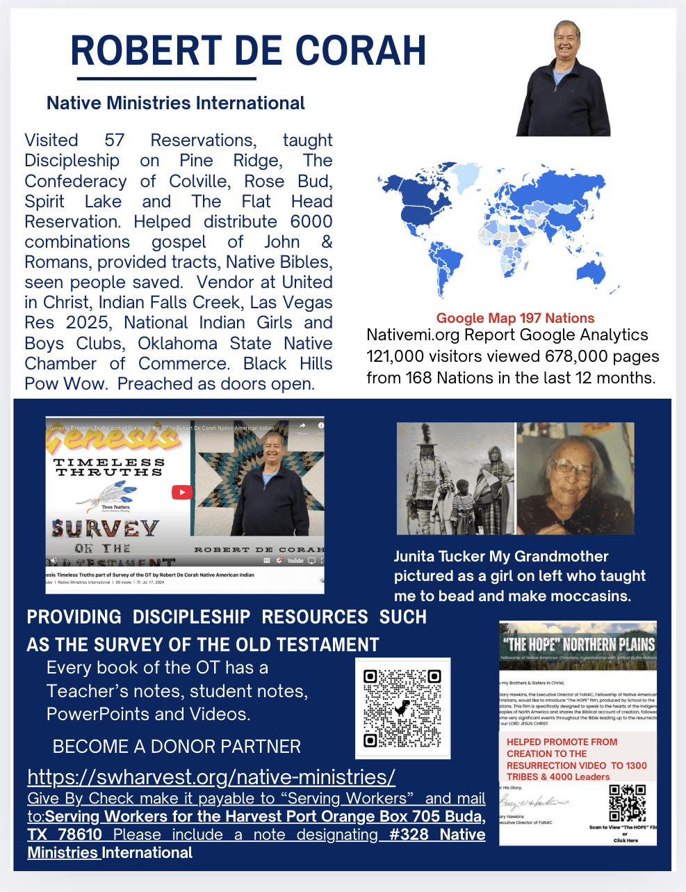 An overview of Native Ministries International with the ability to contribute helping reach about 10,000 a month and enabling Founder Robert De Corah to go and help make Disciples of all nations.