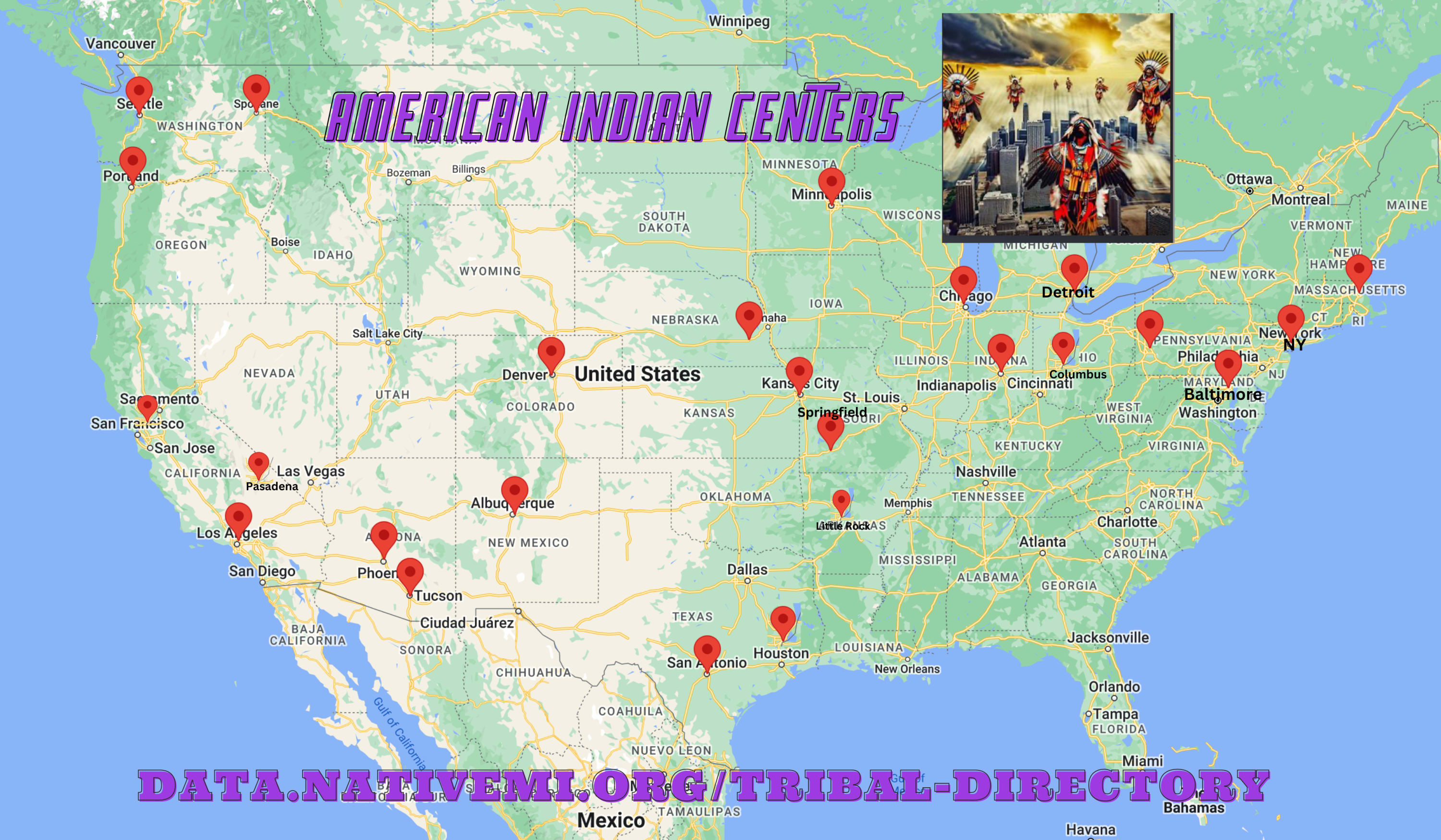 A national map of American Indian Centers in the USA listing 24+ as Native Ministries International
